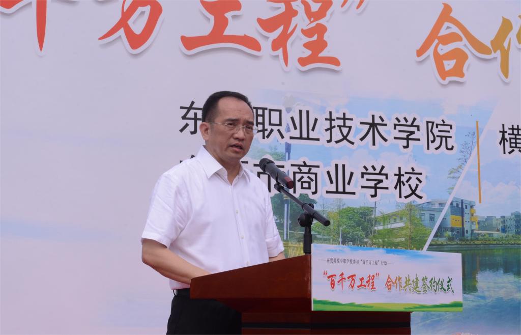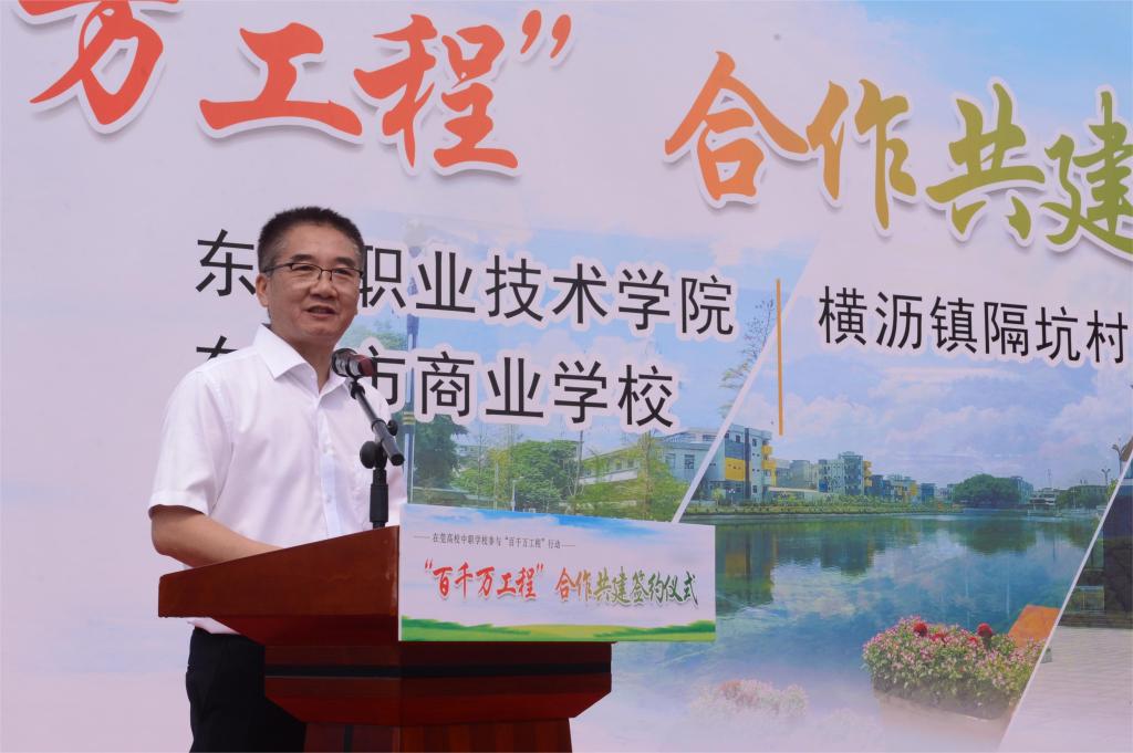 3月29日上午,我校与横沥镇隔坑村及东莞市商业学校在横沥镇隔坑公园举行“百千万工程”合作共建签约仪式。共建代表一同签订《在莞高校中职学校参与“百县千镇万村高质量发展工程”行动协议书》,并为两校“百千万工程”服务突击队进行授牌。