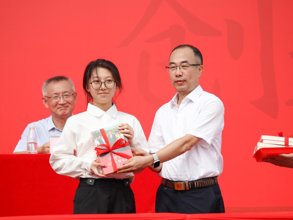 校党委副书记、校长贺定修在典礼上向学生代表赠送《习近平与大学生朋友们》,希望同学们更直观地感受到新时代青年立志听党号召、扎根基层、奉献社会的真挚情感。
