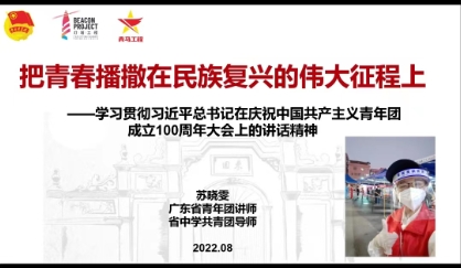 我校继续教育学院与东莞团市委学校部通力合作,为中学生团员骨干安排了习近平总书记在庆祝中国共产主义青年团成立100周年大会上的重要讲话、东莞百年青年运动史、中学志愿服务项目建设与管理、新媒体运营等丰富的学习内容。通过5天的培训,进一步提升了团员骨干的思想政治觉悟和整体素质,激励团员骨干坚定理想信念,努力成为堪当大任的新时代青年,汇聚起磅礴的青春力量,以优异成绩向党的二十大诚挚献礼。